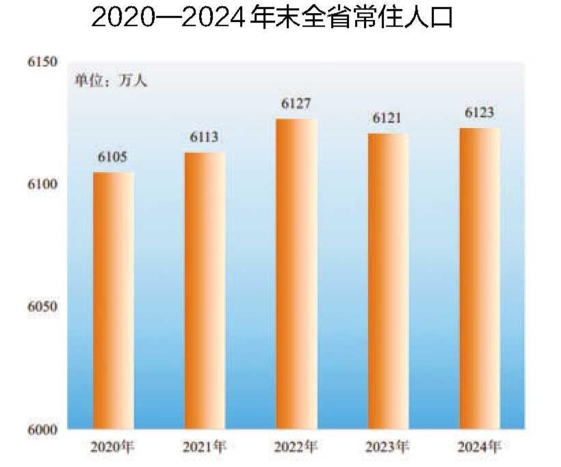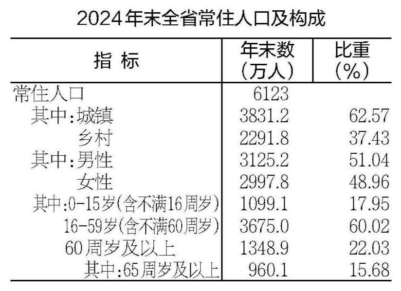 年末全省常住人口6123萬人,比上年末增加2萬人。全年出生人口37.8萬人,出生率為6.17‰;死亡人口51.5萬人,死亡率為8.41‰。常住人口城鎮(zhèn)化率為62.57%,提高1.06個(gè)百分點(diǎn)。
