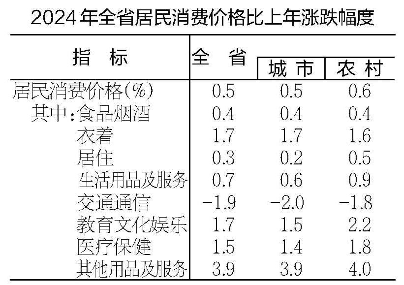 全年居民消費(fèi)價(jià)格比上年上漲0.5%,其中食品煙酒價(jià)格上漲0.4%。工業(yè)生產(chǎn)者出廠價(jià)格下降2.8%。工業(yè)生產(chǎn)者購進(jìn)價(jià)格下降2.8%。農(nóng)產(chǎn)品生產(chǎn)價(jià)格下降1.3%。