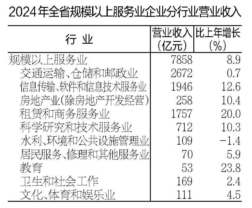 全年規(guī)模以上服務(wù)業(yè)企業(yè)營業(yè)收入7858億元,比上年增長8.9%;利潤438億元,增長4.8%。