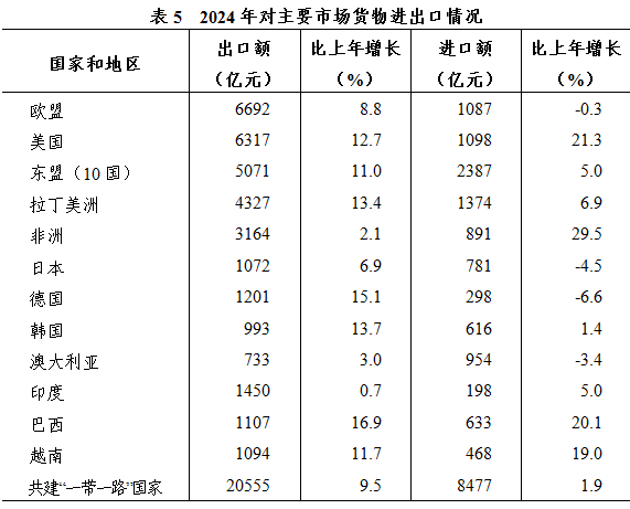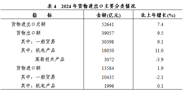 全年貨物進出口52641億元,比上年增長7.4%,其中出口和進口分別為39057和13584億元,分別增長9.5%和1.9%;規(guī)模分別居全國第三、第二和第五位,占全國份額分別為12.0%、15.3%和7.4%,進出口、出口占全國份額均比上年提高0.3個百分點。有進出口貿(mào)易的國別(地區(qū))達252個;對中東、非洲、東盟、拉美進出口分別增長3.2%、7.1%、9.0%和11.8%,合計拉動全省進出口增長3.4個百分點;對共建“一帶一路”國家進出口增長7.2%;對歐盟、美國進出口分別增長7.4%和13.9%。出口商品結(jié)構(gòu)轉(zhuǎn)型升級,機電產(chǎn)品出口增長11.0%,占全省出口的46.2%。