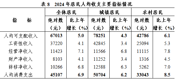 全年居民人均消費支出45107元,比上年增長6.9%,扣除價格因素實際增長6.6%。按常住地分,城鎮(zhèn)居民人均消費支出50704元,增長6.2%,農(nóng)村居民人均消費支出33043元,增長8.5%,扣除價格因素實際分別增長5.9%和8.2%。
