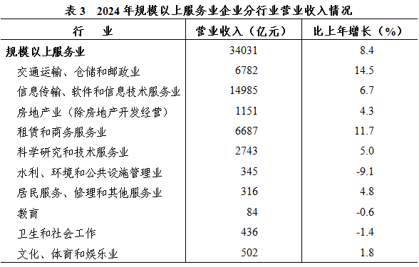全年服務(wù)業(yè)增加值52762億元,比上年增長5.1%。其中,租賃和商務(wù)服務(wù)業(yè)、信息傳輸軟件和信息技術(shù)服務(wù)業(yè)、金融業(yè)、住宿和餐飲業(yè)增加值分別增長9.7%、8.5%、7.2%和5.5%。規(guī)模以上服務(wù)業(yè)[6]企業(yè)營業(yè)收入34031億元,增長8.4%;利潤總額3740億元,增長5.8%。