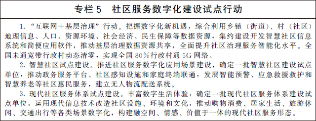 開發(fā)社區(qū)協(xié)商議事、政務(wù)服務(wù)辦理、養(yǎng)老、家政、衛(wèi)生、托育等網(wǎng)上服務(wù)項目應(yīng)用,推動社區(qū)物業(yè)設(shè)備設(shè)施、安防等智能化改造升級。集約建設(shè)智慧社區(qū)信息系統(tǒng),開發(fā)智慧社區(qū)移動應(yīng)用服務(wù),加速線上線下融合。推進數(shù)字社區(qū)服務(wù)圈、智慧家庭建設(shè),促進社區(qū)家庭聯(lián)動智慧服務(wù)生活圈發(fā)展。大力發(fā)展社區(qū)電子商務(wù),探索推動無人物流配送進社區(qū)。推動“互聯(lián)網(wǎng)+”與社區(qū)服務(wù)的深度融合,逐步構(gòu)建服務(wù)便捷、管理精細、設(shè)施智能、環(huán)境宜居、私密安全的智慧社區(qū)。以縣(市、區(qū)、旗)為單位,支持利用互聯(lián)網(wǎng)、物聯(lián)網(wǎng)、區(qū)塊鏈等現(xiàn)代信息技術(shù),深入組織開展智慧社區(qū)、現(xiàn)代社區(qū)服務(wù)體系試點建設(shè),高效匹配社區(qū)全生活鏈供需,擴大多層次便利化社會服務(wù)供給。鼓勵社會資本投資建設(shè)智慧社區(qū),運用第五代移動通信(5G)、物聯(lián)網(wǎng)等現(xiàn)代信息技術(shù)推進智慧社區(qū)信息基礎(chǔ)設(shè)施建設(shè)。