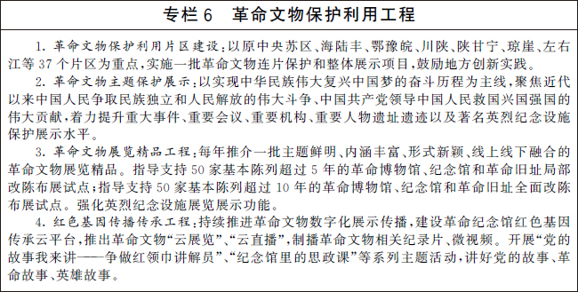 整合文物、黨史、軍史、檔案、地方志等方面研究力量,加強革命文物保護利用研究,開展實物、文獻、檔案、史料和口述史征集,挖掘革命文物深刻內(nèi)涵,推出重要研究成果,旗幟鮮明反對和抵制歷史虛無主義,繼續(xù)發(fā)揚偉大建黨精神,傳承弘揚井岡山精神、長征精神、遵義會議精神、延安精神、西柏坡精神、紅巖精神、抗美援朝精神、“兩彈一星”精神、特區(qū)精神、抗洪精神、抗震救災(zāi)精神、抗疫精神、脫貧攻堅精神等偉大精神。