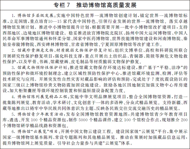 實施中國特色世界一流博物館創(chuàng)建計劃。支持省級、重要地市級博物館特色化發(fā)展。盤活基層博物館資源。探索建立行業(yè)博物館聯(lián)合認證、共建共管機制。規(guī)范和扶持非國有博物館發(fā)展,落實支持政策,依法依規(guī)推進非國有博物館法人財產(chǎn)權(quán)確權(quán)。認真履行相關(guān)審批程序,有序推動建設(shè)一批反映黨和國家建設(shè)成就的當(dāng)代主題博物館和行業(yè)博物館,重點支持建設(shè)反映中華文明發(fā)展歷程的國家級重點專題博物館,倡導(dǎo)建設(shè)特色專題博物館。探索在文化資源豐厚地區(qū)建設(shè)“博物館之城”。