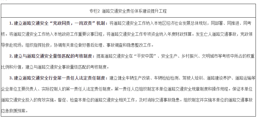 建立健全各級道路交通安全工作協(xié)調(diào)機制,堅持黨政同責、一崗雙責、齊抓共管、失職追責,落實黨政領(lǐng)導(dǎo)干部道路交通安全責任制,推行道路交通死亡事故黨政領(lǐng)導(dǎo)到場制度。加大道路交通安全在“平安中國”、安全生產(chǎn)、鄉(xiāng)村振興、文明城市等考核中的權(quán)重,建立量級匹配的考核制度,真正形成責任全覆蓋、管理全方位、過程全監(jiān)管的道路交通安全綜合治理格局。建立道路交通安全部門協(xié)作責任制,明確監(jiān)管責任,細化責任清單,完善監(jiān)管鏈條,真正形成監(jiān)管合力。建立健全道路交通安全隱患排查治理體系,健全全鏈條、可追溯的管理機制。