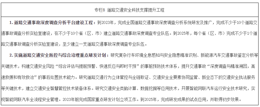健全產(chǎn)、學(xué)、研、用深度融合的協(xié)同創(chuàng)新機制,形成行業(yè)需求引領(lǐng)、有效分工協(xié)作、科技創(chuàng)新支撐的新格局。深化道路交通全要素協(xié)同管控理論及技術(shù)研究,建構(gòu)滿足道路交通安全高質(zhì)量發(fā)展的國家技術(shù)標準體系,做好交通安全科技頂層設(shè)計。匯聚各類創(chuàng)新成果,促進道路交通安全科技成果在交通安全治理中的應(yīng)用推廣。健全道路交通事故深度調(diào)查技術(shù)支撐體系,建設(shè)全國道路交通事故深度調(diào)查分析系統(tǒng),建立道路交通事故深度調(diào)查專業(yè)隊伍,推動在全國范圍內(nèi)建設(shè)道路交通事故調(diào)查分析實驗室。推動部門層面共享涉及輔助駕駛、自動駕駛相關(guān)事故數(shù)據(jù)。