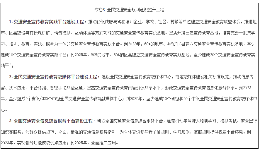 完善駕駛培訓(xùn)監(jiān)管機制,強化駕駛培訓(xùn)機構(gòu)落實教學(xué)基礎(chǔ)設(shè)施設(shè)備、培訓(xùn)學(xué)時內(nèi)容等要求,保證駕駛培訓(xùn)質(zhì)量。健全完善駕駛培訓(xùn)教學(xué)體系,推動理論培訓(xùn)方式創(chuàng)新應(yīng)用,強化駕駛?cè)税踩R、規(guī)則意識、風險辨識能力培養(yǎng)。加強駕駛培訓(xùn)過程監(jiān)管,強化駕駛培訓(xùn)與考試的信息共享。加強駕駛考試過程監(jiān)管,建立以新駕駛?cè)税踩{駛水平為核心的考試質(zhì)量評估體系,實行嚴重交通事故駕駛?cè)丝荚嚢l(fā)證責任倒查。優(yōu)化駕駛?cè)丝荚噧?nèi)容與方法,完善面向規(guī)則意識培育的駕駛?cè)丝荚嚈C制,探索VR、人工智能等新技術(shù)在駕駛考試管理中的應(yīng)用。主動適應(yīng)人口老齡化、車輛智能化等社會發(fā)展需求,豐富車輛新技術(shù)、駕駛新要求等考核內(nèi)容。健全完善職業(yè)駕駛?cè)私逃嘤?xùn)體系,提升重點駕駛?cè)税踩芾硭?。建立交通安全信息綜合服務(wù)平臺,提供駕駛?cè)巳芷?、全分類群體、全出行場景的交通安全知識服務(wù)。