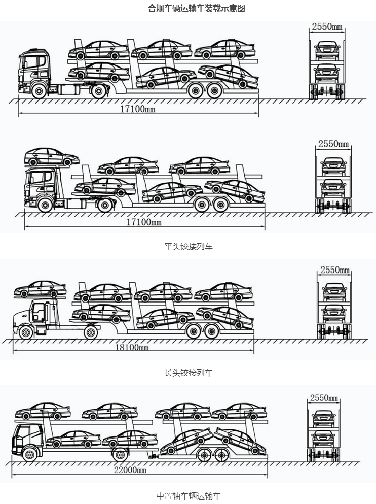 3.中置軸車輛運(yùn)輸車裝載9輛以上的,嚴(yán)格執(zhí)行裝載長(zhǎng)度不得超過22米、寬度不得超過2.55米、高度不得超過4米的要求。不符合要求的,公安交通管理部門依據(jù)《道路交通安全法》第九十條、《道路交通安全法實(shí)施條例》第五十四條規(guī)定,處警告或者二十元以上二百元以下罰款、記分,并根據(jù)《行政處罰法》第二十八條責(zé)令當(dāng)事人改正違法行為。若裝載乘用車車型較小,上層單排平放5輛車(不得上下左右傾斜)前后均不超過車輛運(yùn)輸車外廓尺寸的,可允許裝載9輛車。