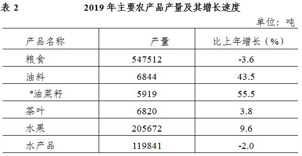全年糧食總產(chǎn)量54.75萬噸,比上年下降3.6%。預計油料總產(chǎn)量6844噸,比上年增長43.5 %,其中油菜籽5919噸,比上年增長55.5%;茶葉總產(chǎn)量6820噸,比上年增長3.8 %;水果總產(chǎn)量20.57萬噸,比上年增長9.6%。