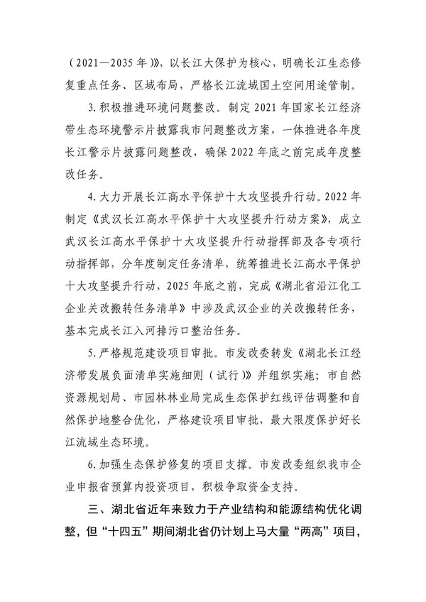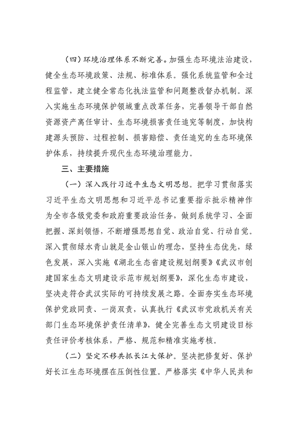 《整改方案》列出了整改措施清單。對每個問題逐一明確責(zé)任領(lǐng)導(dǎo)、責(zé)任單位、責(zé)任人、整改目標(biāo)、整改時限、整改措施,實(shí)行清單化管理。在堅(jiān)決完成督察整改任務(wù)的同時,舉一反三,制定了5個方面的強(qiáng)化措施。一是深入踐行習(xí)近平生態(tài)文明思想。把學(xué)習(xí)貫徹習(xí)近平生態(tài)文明思想和習(xí)近平總書記重要指示批示精神作為全市各級黨委和政府重要政治任務(wù),做到系統(tǒng)學(xué)習(xí)、全面把握和深刻領(lǐng)悟,不斷增強(qiáng)思想自覺、政治自覺和行動自覺。深入貫徹綠水青山就是金山銀山的理念,堅(jiān)持生態(tài)優(yōu)先,綠色發(fā)展,深化生態(tài)市建設(shè),堅(jiān)決走符合武漢實(shí)際的可持續(xù)發(fā)展之路。全面夯實(shí)生態(tài)環(huán)境保護(hù)“黨政同責(zé)、一崗雙責(zé)”,健全完善生態(tài)文明建設(shè)目標(biāo)責(zé)任評價考核體系。二是堅(jiān)定不移共抓長江大保護(hù)。堅(jiān)決把修復(fù)好、保護(hù)好長江生態(tài)環(huán)境擺在壓倒性位置。嚴(yán)格落實(shí)《中華人民共和國長江保護(hù)法》,大力實(shí)施武漢長江高水平保護(hù)十大攻堅(jiān)提升行動,持續(xù)推進(jìn)長江流域生態(tài)保護(hù)和修復(fù),切實(shí)加強(qiáng)礦山污染治理、生態(tài)修復(fù)和日常管控。突出加強(qiáng)長江水污染防治,深入推進(jìn)長江入河排污口溯源整治,加快建設(shè)完善環(huán)境基礎(chǔ)設(shè)施,持續(xù)實(shí)施湖泊生態(tài)環(huán)境保護(hù),保障湖泊功能。三是深入打好污染防治攻堅(jiān)戰(zhàn)。堅(jiān)持方向不變、力度不減,延伸深度、拓展廣度,深入打好藍(lán)天、碧水、凈土三大保衛(wèi)戰(zhàn)。統(tǒng)籌水資源、水生態(tài)、水環(huán)境“三水共治”。組織實(shí)施重污染天氣消除等標(biāo)志性戰(zhàn)役,到2025年,全市重度及以上污染天數(shù)比率控制在0.3%以內(nèi)。加強(qiáng)地下水污染源頭防控和風(fēng)險管控,深入開展農(nóng)業(yè)面源污染治理。四是加快推動實(shí)現(xiàn)綠色崛起。貫徹落實(shí)黨中央關(guān)于碳達(dá)峰碳中和的決策部署,先立后破、通盤謀劃、精細(xì)操作,穩(wěn)步有序推進(jìn)碳達(dá)峰碳中和工作,加快形成節(jié)約資源和保護(hù)環(huán)境的產(chǎn)業(yè)結(jié)構(gòu)、生產(chǎn)方式、生活方式、空間格局。大力支持綠色技術(shù)創(chuàng)新,全面發(fā)揮武漢高??蒲袃?yōu)勢,推進(jìn)產(chǎn)學(xué)研深度融合。培育壯大綠色技術(shù)創(chuàng)新主體,打造中部綠色技術(shù)創(chuàng)新引領(lǐng)區(qū)。五是持續(xù)提升現(xiàn)代環(huán)境治理能力和水平。深入推進(jìn)生態(tài)環(huán)境領(lǐng)域“放管服”改革,深化生態(tài)保護(hù)補(bǔ)償制度改革,推進(jìn)市場化、多元化補(bǔ)償實(shí)踐。加強(qiáng)生態(tài)環(huán)保領(lǐng)域地方立法和政策保障,深化生態(tài)環(huán)境領(lǐng)域依法行政,對破壞生態(tài)環(huán)境的行為決不手軟,對生態(tài)環(huán)境違法犯罪行為依法嚴(yán)懲。加快構(gòu)建全民環(huán)保行動體系,推動形成節(jié)約適度、綠色低碳、文明健康的生活和消費(fèi)方式,促進(jìn)經(jīng)濟(jì)社會發(fā)展全面綠色轉(zhuǎn)型。