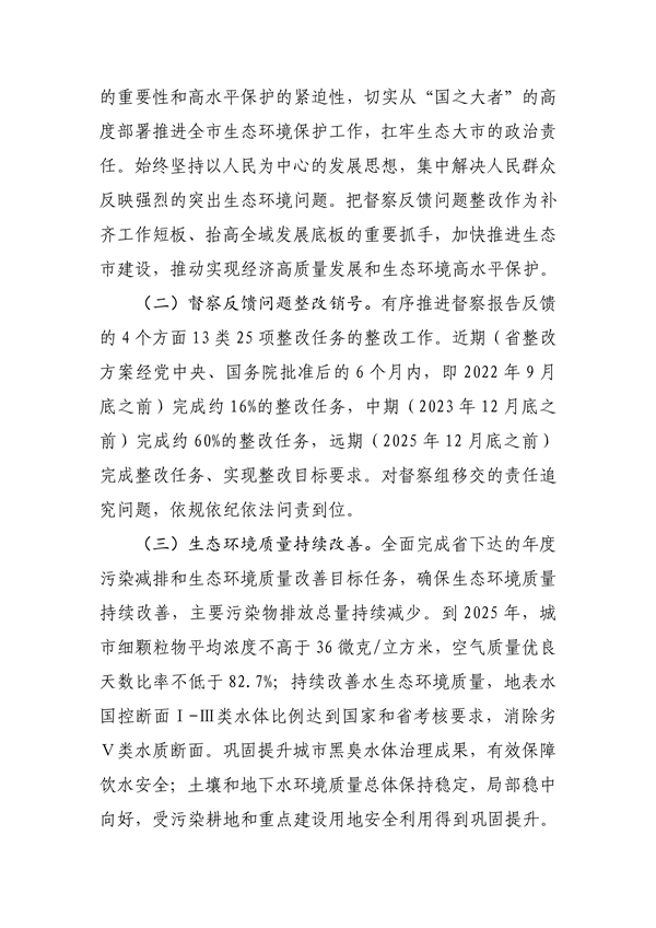 《整改方案》明確了四個方面整改工作目標(biāo):一是思想認(rèn)識水平顯著提高。進(jìn)一步對標(biāo)習(xí)近平生態(tài)文明思想檢視差距、查找不足,切實(shí)從“國之大者”的高度部署推進(jìn)全市生態(tài)環(huán)境保護(hù)工作,扛牢生態(tài)大市的政治責(zé)任。二是督察反饋問題整改銷號。有序推進(jìn)督察報告反饋的4個方面13類25項(xiàng)整改任務(wù)的整改工作。其中計劃在2022年9月底前完成4項(xiàng),2022年底前累計完成11項(xiàng),2023年底前累計完成15項(xiàng),2025年底前全部完成。三是生態(tài)環(huán)境質(zhì)量持續(xù)改善。到2025年,城市細(xì)顆粒物濃度不高于36微克/立方米,空氣質(zhì)量優(yōu)良天數(shù)比率不低于82.7%;持續(xù)改善水生態(tài)環(huán)境質(zhì)量,地表水國控斷面Ⅰ-Ⅲ類水體比例達(dá)到國家和省考核要求,消除劣Ⅴ類水質(zhì)斷面,有效保障飲水安全。四是環(huán)境治理體系不斷完善。加強(qiáng)生態(tài)環(huán)境法治建設(shè),健全生態(tài)環(huán)境政策、法規(guī)、標(biāo)準(zhǔn)體系。加快構(gòu)建源頭預(yù)防、過程控制、損害賠償、責(zé)任追究的生態(tài)環(huán)境保護(hù)體系,持續(xù)提升現(xiàn)代生態(tài)環(huán)境治理能力。