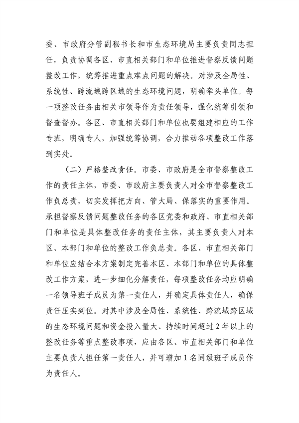 為保障整改工作順利開展,《整改方案》明確了5個方面組織保障措施。一是強(qiáng)化組織領(lǐng)導(dǎo)。市環(huán)境保護(hù)督察工作領(lǐng)導(dǎo)小組統(tǒng)籌推進(jìn)中央生態(tài)環(huán)境保護(hù)督察反饋問題整改。設(shè)立市貫徹落實(shí)中央生態(tài)環(huán)境保護(hù)督察反饋意見整改工作專班,協(xié)調(diào)各區(qū)、市級有關(guān)部門和單位推進(jìn)督察反饋問題整改工作。對涉及全局性、系統(tǒng)性、跨流域跨區(qū)域的生態(tài)環(huán)境問題,明確牽頭單位。每一項(xiàng)整改任務(wù)由相關(guān)市領(lǐng)導(dǎo)作為責(zé)任領(lǐng)導(dǎo),強(qiáng)化統(tǒng)籌引領(lǐng)和督查督辦。二是嚴(yán)格整改責(zé)任。承擔(dān)督察反饋問題整改任務(wù)的各區(qū)黨委和政府、市級有關(guān)部門和單位是整改工作的責(zé)任主體,其主要負(fù)責(zé)人對本地、本部門和單位的整改工作負(fù)總責(zé)。各區(qū)、市級有關(guān)部門和單位應(yīng)制定完善本地、本部門和單位的具體整改工作方案,進(jìn)一步細(xì)化分解責(zé)任,每項(xiàng)整改任務(wù)均應(yīng)明確一名領(lǐng)導(dǎo)班子成員為第一責(zé)任人,并確定具體責(zé)任人,確保責(zé)任壓實(shí)到位。三是健全整改機(jī)制。根據(jù)全省整改交賬計劃,對整改任務(wù)實(shí)行臺賬式管理,定期調(diào)度、交賬。其中在近期集中整改的6個月期限內(nèi),實(shí)行每月一調(diào)度,雙月一交賬。建立督察整改完成情況驗(yàn)收制度,對整改任務(wù)實(shí)施動態(tài)管理,推動整改落實(shí)。四是嚴(yán)肅責(zé)任追究。加強(qiáng)對整改落實(shí)的跟進(jìn)監(jiān)督,對整改工作中出現(xiàn)的敷衍整改、表面整改、假裝整改和搞“一刀切”等形式主義、官僚主義問題,依規(guī)依紀(jì)依法追究相關(guān)單位和人員責(zé)任。五是強(qiáng)化信息公開。充分運(yùn)用報刊、電視、網(wǎng)絡(luò)以及新媒體,及時宣傳報道整改工作成效、公開整改工作進(jìn)展、曝光典型案例問責(zé)情況,回應(yīng)社會關(guān)切,主動接受群眾監(jiān)督。強(qiáng)化輿論引導(dǎo),調(diào)動全社會參與生態(tài)環(huán)境保護(hù)的主人翁意識,努力營造環(huán)境保護(hù)人人有責(zé)的良好氛圍。