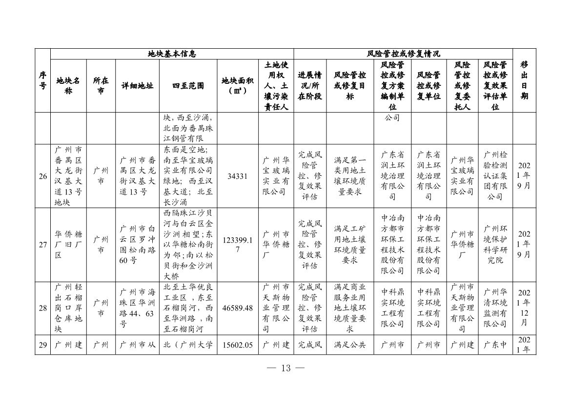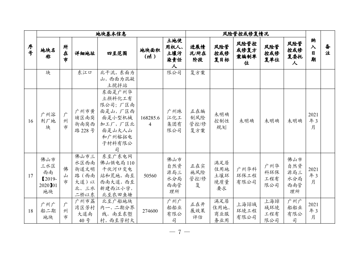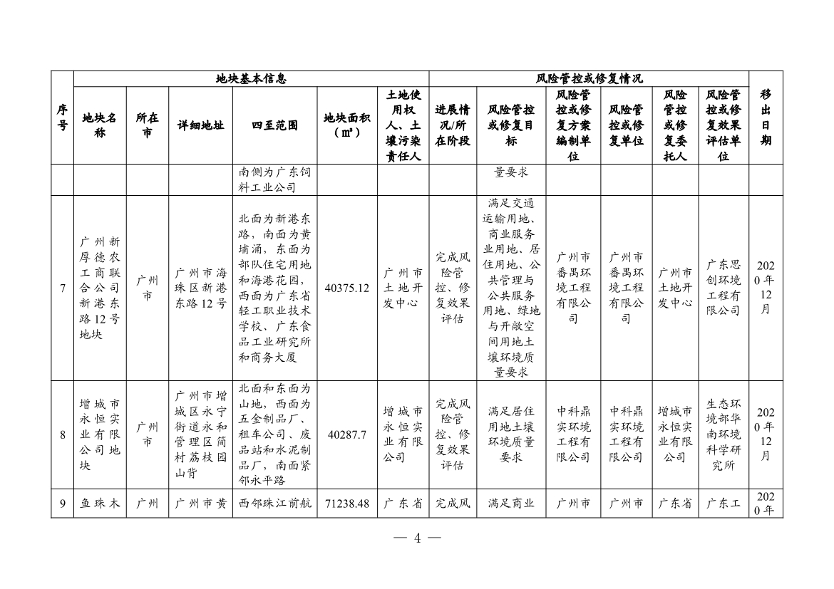 根據(jù)建設(shè)用地土壤污染風(fēng)險(xiǎn)管控和修復(fù)效果評(píng)估情況,將廣州市的白云區(qū)黃金圍貨運(yùn)站地塊、廣東農(nóng)墾南沙西部工業(yè)區(qū)工業(yè)四路地塊、宏昌電子材料股份有限公司地塊共3個(gè)地塊移出名錄。