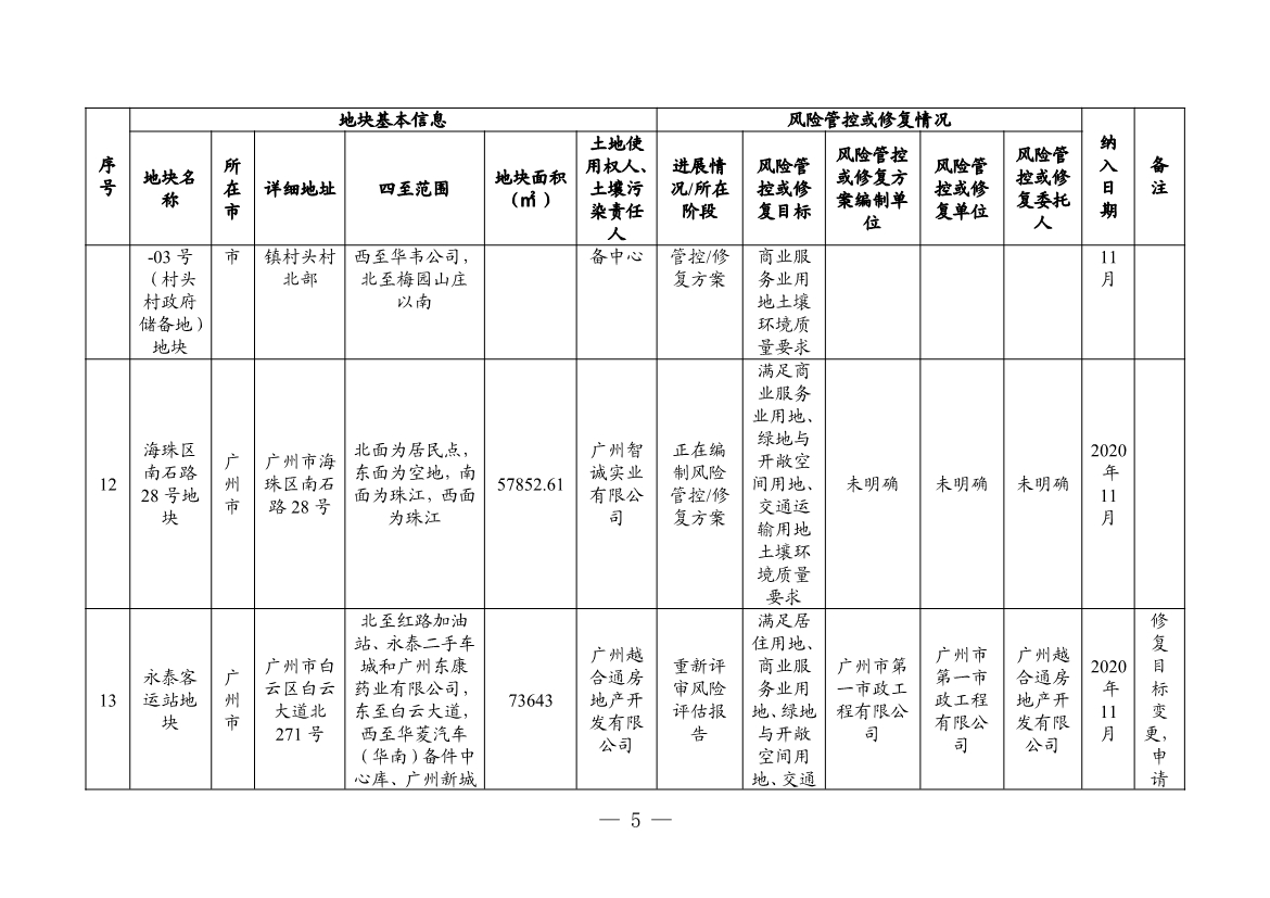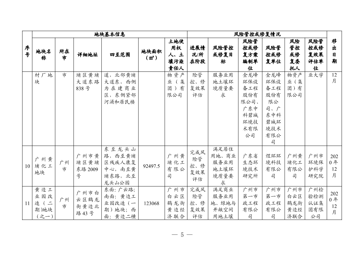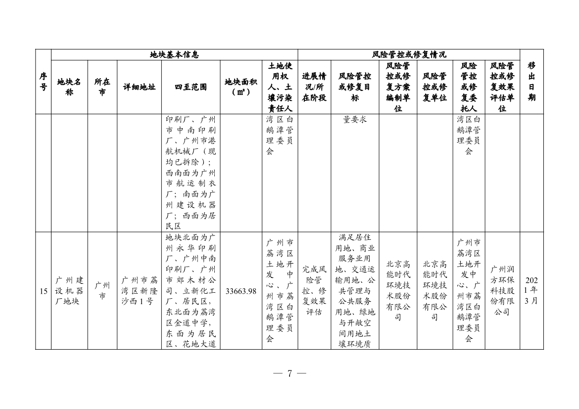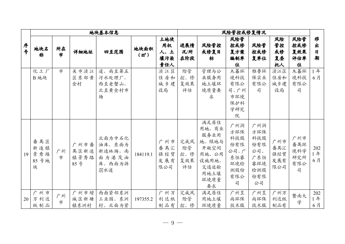 根據(jù)建設(shè)用地土壤污染風(fēng)險(xiǎn)管控和修復(fù)效果評(píng)估情況,將廣州市的白云區(qū)黃金圍貨運(yùn)站地塊、廣東農(nóng)墾南沙西部工業(yè)區(qū)工業(yè)四路地塊、宏昌電子材料股份有限公司地塊共3個(gè)地塊移出名錄。