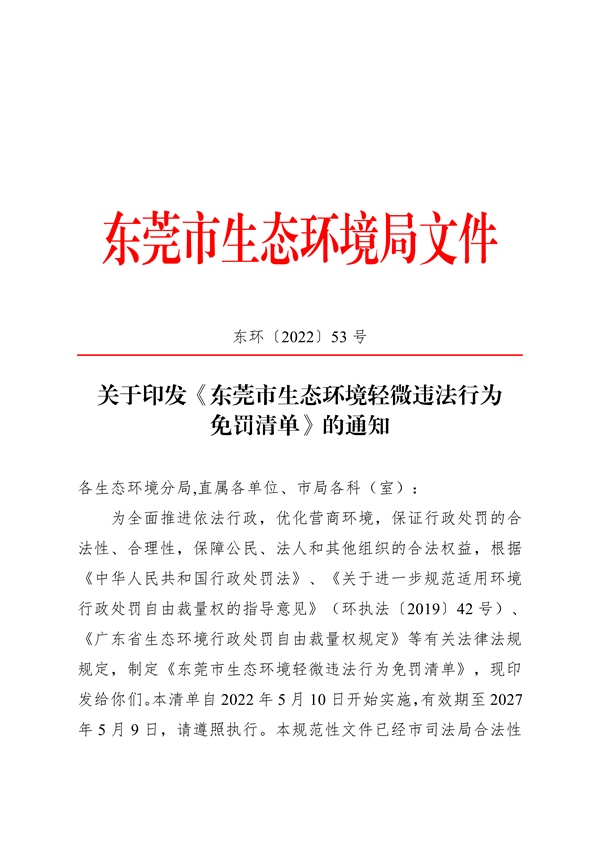 《關(guān)于印發(fā)<東莞市生態(tài)環(huán)境輕微違法行為免罰清單>的通知》(東環(huán)【2022】53號(hào))