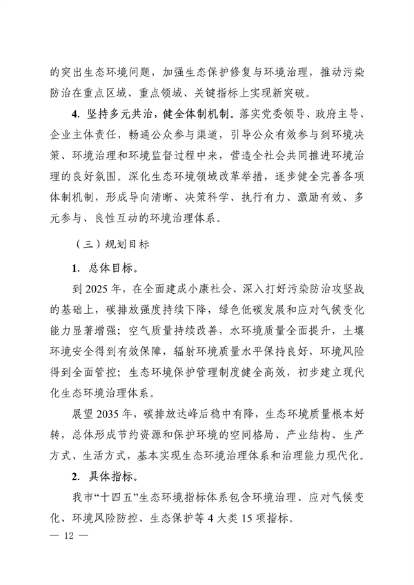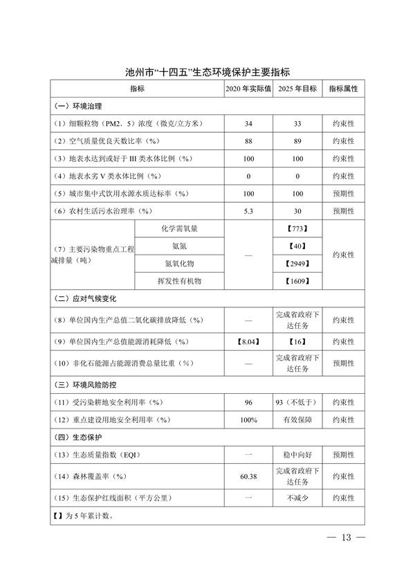 安徽省池州市生態(tài)環(huán)境局、池州市發(fā)展和改革委員會聯(lián)合印發(fā)《池州市“十四五”生態(tài)環(huán)境保護(hù)規(guī)劃》,目標(biāo)到2025年,碳排放強(qiáng)度持續(xù)下降,綠色低碳發(fā)展和應(yīng)對氣候變化能力顯著增強(qiáng);空氣質(zhì)量持續(xù)改善,水環(huán)境質(zhì)量全面提升,土壤環(huán)境安全得到有效保障,輻射環(huán)境質(zhì)量水平保持良好,環(huán)境風(fēng)險(xiǎn)得到全面管控;生態(tài)環(huán)境保護(hù)管理制度健全高效,初步建立現(xiàn)代化生態(tài)環(huán)境治理體系?!笆奈濉鄙鷳B(tài)環(huán)境指標(biāo)體系包含環(huán)境治理、應(yīng)對氣候變化、環(huán)境風(fēng)險(xiǎn)防控、生態(tài)保護(hù)等 4 大類 15 項(xiàng)指標(biāo)。