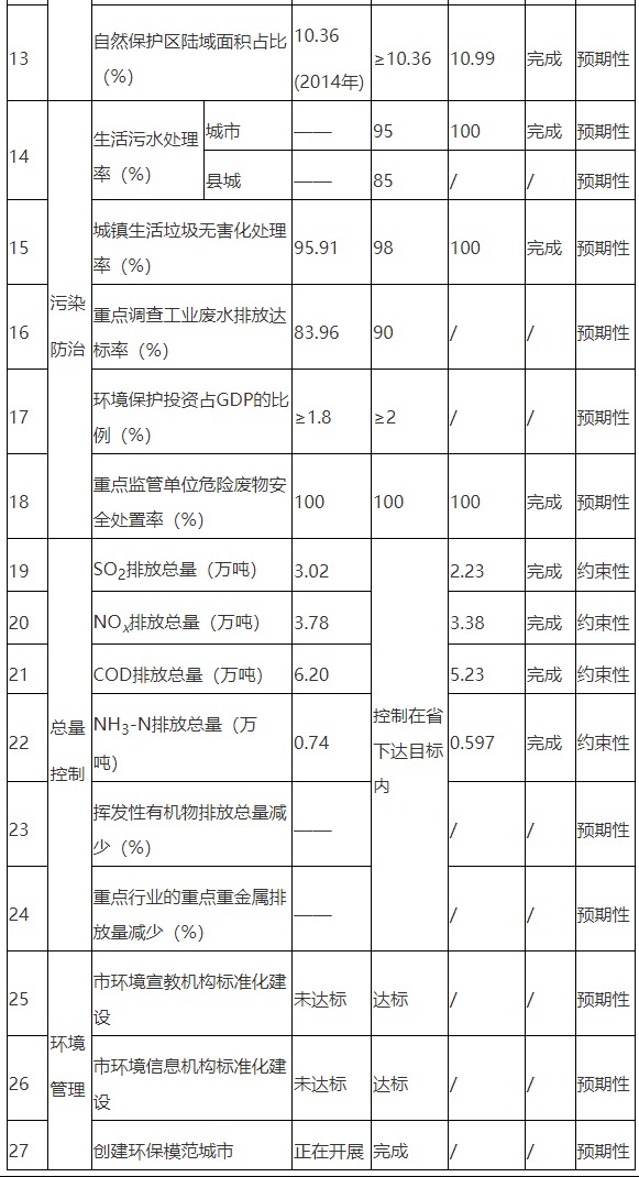 梅州市環(huán)境保護(hù)與生態(tài)建設(shè)“十三五”規(guī)劃實(shí)施情況總體良好,27項(xiàng)指標(biāo)中,除8項(xiàng)因統(tǒng)計(jì)口徑變化等原因缺乏數(shù)據(jù)外,其余19項(xiàng)全部完成規(guī)劃目標(biāo),其中城市空氣質(zhì)量?jī)?yōu)良天數(shù)比例、PM2.5年均濃度、地表水水質(zhì)優(yōu)良(達(dá)到或優(yōu)于III類(lèi))比例等主要約束性指標(biāo)超額完成目標(biāo)。