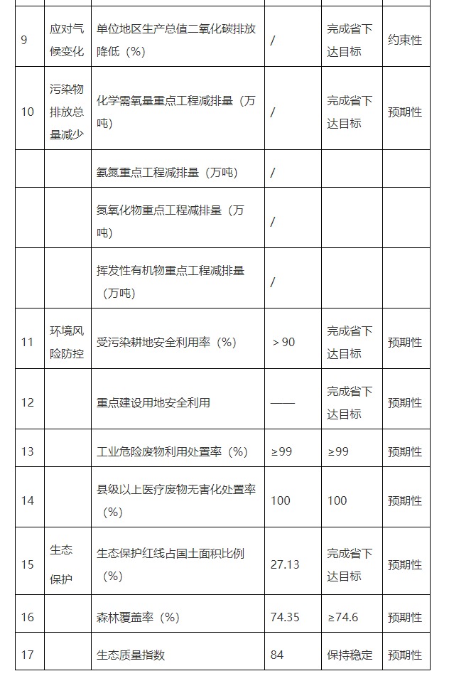 注:生態(tài)保護(hù)紅線(xiàn)為2020年12月省政府報(bào)送國(guó)家版本,后續(xù)以批復(fù)結(jié)果為準(zhǔn);生態(tài)質(zhì)量指數(shù)由于指標(biāo)核算方法尚未明確,暫采用省生態(tài)環(huán)境廳公布的2019年生態(tài)環(huán)境狀況指數(shù),2020年數(shù)據(jù)尚未公布;各項(xiàng)指標(biāo)的指標(biāo)屬性,與國(guó)家和省有關(guān)要求保持一致。