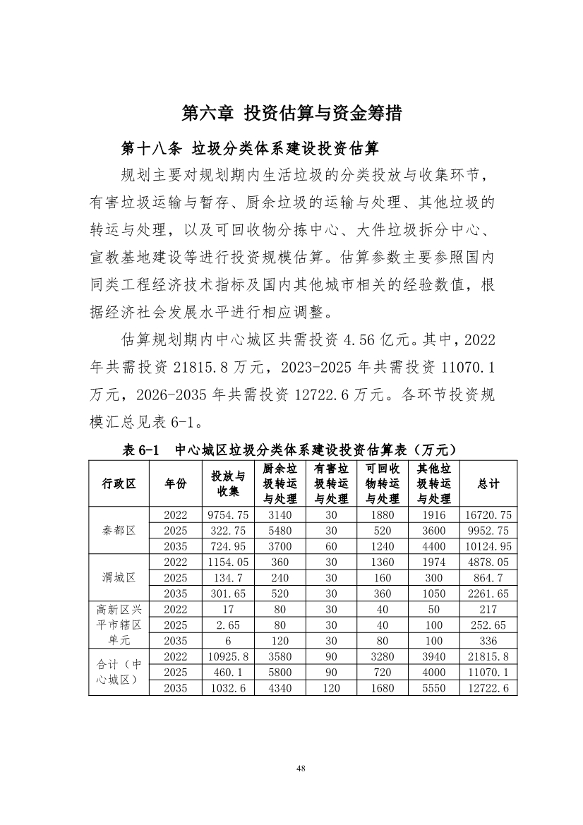 日前,咸陽印發(fā)《咸陽市城市生活垃圾分類與設(shè)施布局專項(xiàng)規(guī)劃(2021-2035年)》。規(guī)劃提出,規(guī)劃近期以政府投入引導(dǎo)居民分類為主,中期逐步減少政府投入,依靠居民自覺開展垃圾分類。規(guī)劃期內(nèi)中心城區(qū)共需投資4.56億元。 詳情如下: