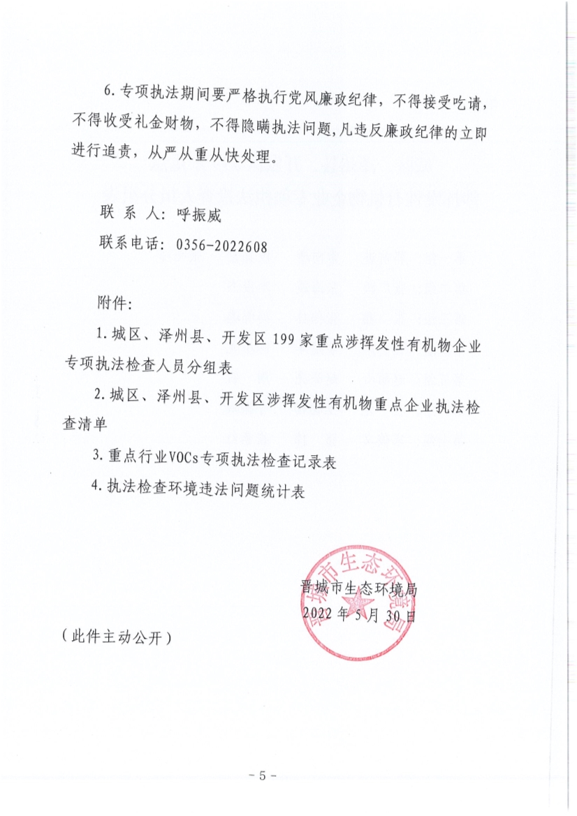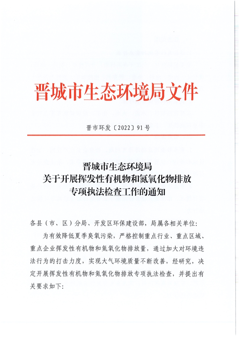 《晉城關(guān)于開展<揮發(fā)性有機(jī)物和氮氧化物排放專項(xiàng)執(zhí)法檢查工作>的通知》(晉市環(huán)法【2022】91號)