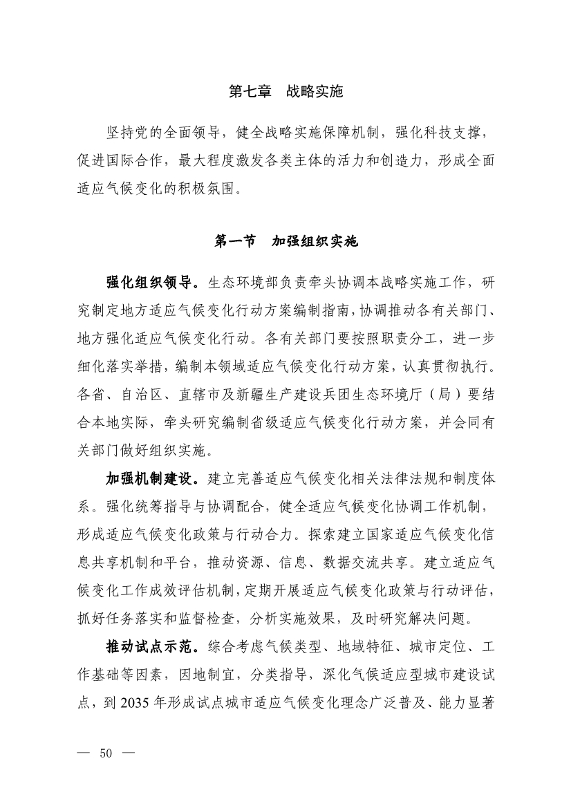 為貫徹實(shí)施積極應(yīng)對(duì)氣候變化國(guó)家戰(zhàn)略,強(qiáng)化適應(yīng)氣候變化行動(dòng)舉措,有效防范氣候變化不利影響和風(fēng)險(xiǎn),我們研究制定了《國(guó)家適應(yīng)氣候變化戰(zhàn)略2035》,現(xiàn)印發(fā)給你們,請(qǐng)認(rèn)真貫徹執(zhí)行。各省、自治區(qū)、直轄市及新疆生產(chǎn)建設(shè)兵團(tuán)生態(tài)環(huán)境廳(局)要根據(jù)戰(zhàn)略要求,牽頭研究編制省級(jí)適應(yīng)氣候變化行動(dòng)方案,并會(huì)同有關(guān)部門做好組織實(shí)施。