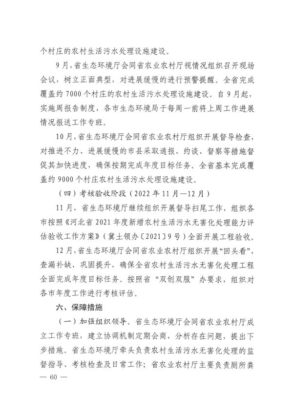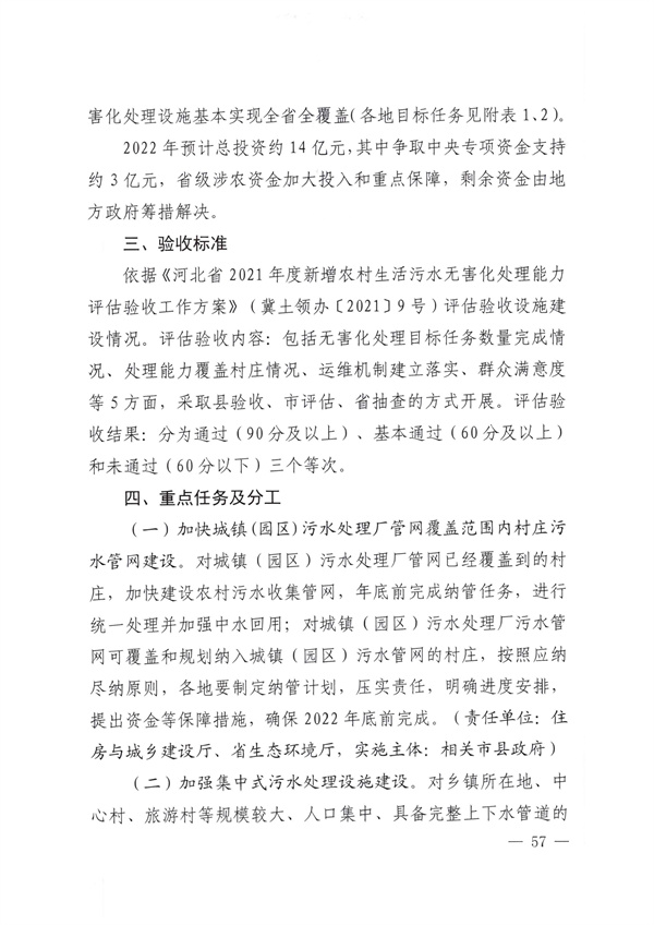 日前,河北省發(fā)布農(nóng)村生活污水無害化處理工程方案,該方案指出加強集中式運水處理設施建設,2022年,突出管網(wǎng)收集和終端無害化處理,強化中水再利用,大力提升農(nóng)村生活污水無害化處理能力,完成覆蓋剩余約9000個村莊的農(nóng)村生活污水處理設施建設。詳情如下: