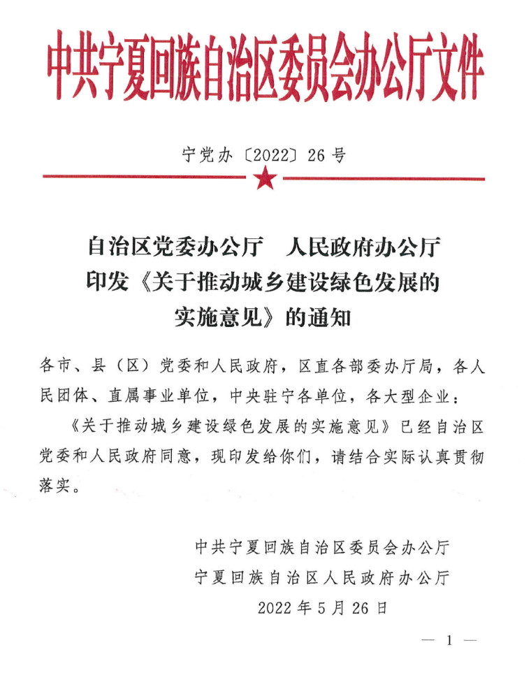 《寧夏回族自治區(qū)印發(fā)了<關(guān)于推動(dòng)城鄉(xiāng)建設(shè)綠色發(fā)展的實(shí)施意見>的通知》(寧黨辦【2022】26號(hào))