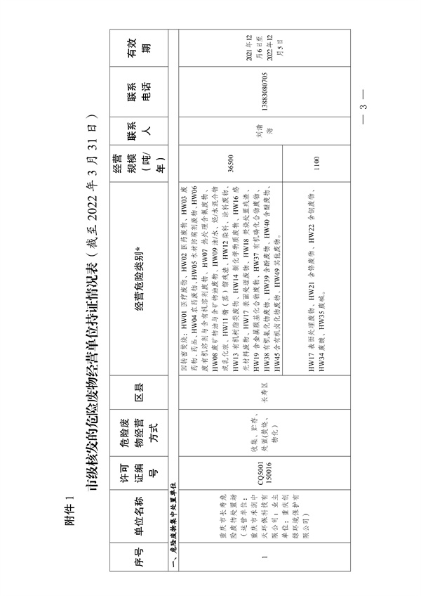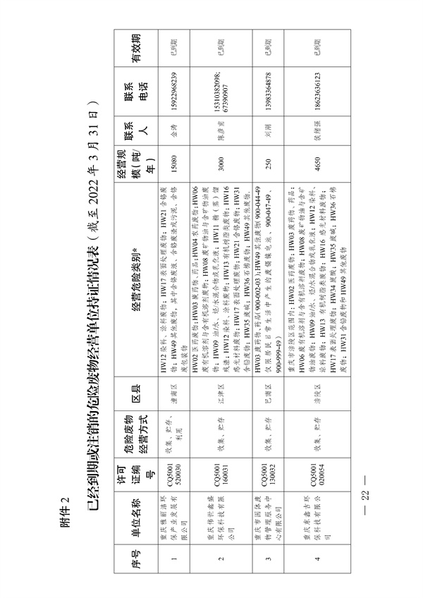 附件:1.市級(jí)核發(fā)的危險(xiǎn)廢物經(jīng)營(yíng)單位持證情況表(截至2022年3月31日)