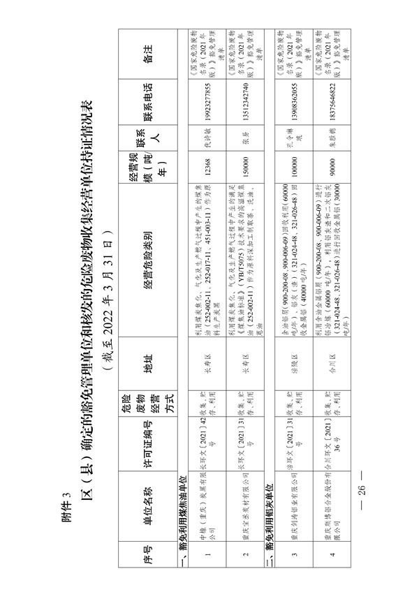 3.區(qū)縣確定的豁免管理單位和核發(fā)的危險(xiǎn)廢物收集經(jīng)營(yíng)單位持證情況表(截至2022年3月31日)