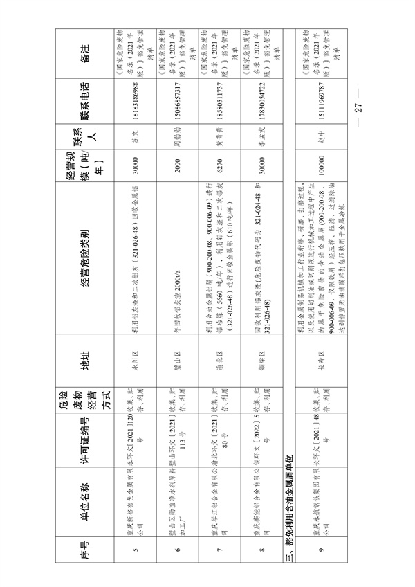 我市現(xiàn)有區(qū)縣核發(fā)的危險(xiǎn)廢物收集經(jīng)營(yíng)許可證持證單位27家(僅限收集機(jī)動(dòng)車維修過(guò)程中產(chǎn)生的廢礦物油),總能力10.1萬(wàn)噸/年。另根據(jù)《國(guó)家危險(xiǎn)廢物名錄(2021年版)》豁免清單確定的煤焦油、鋁灰、含油金屬屑的利用單位以及飛灰固化螯合物處置單位共13家,總能力70.5萬(wàn)噸/年(見(jiàn)附件3)。