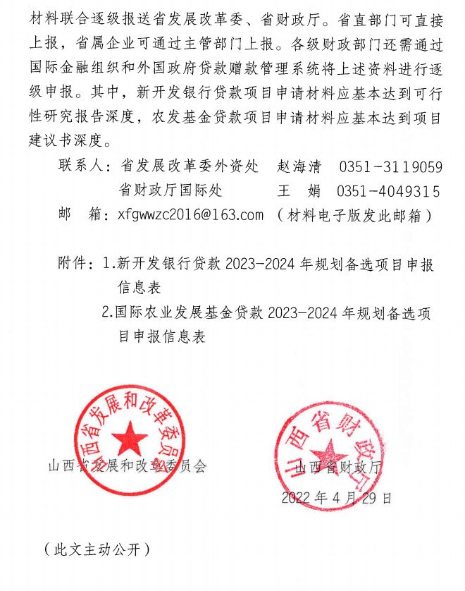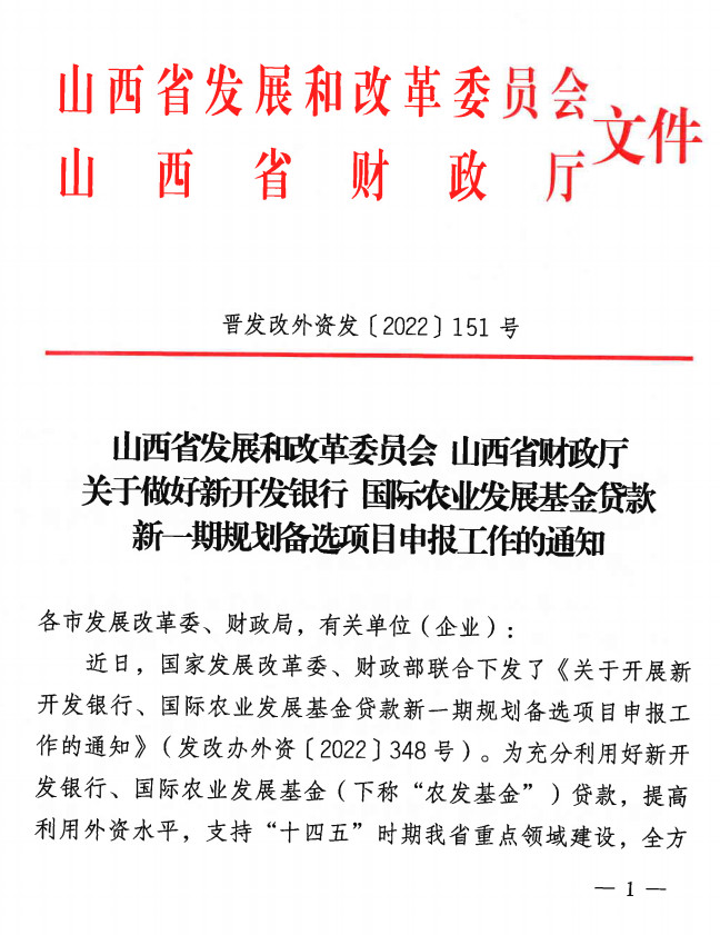 《關(guān)于做好新開發(fā)銀行國際農(nóng)業(yè)發(fā)展基金貸款新一期規(guī)劃備選項(xiàng)目申報(bào)工作的通知》(晉發(fā)改外資發(fā)【2022】151號)