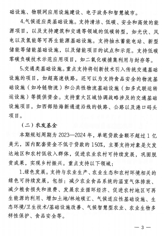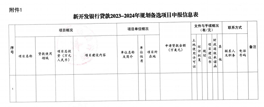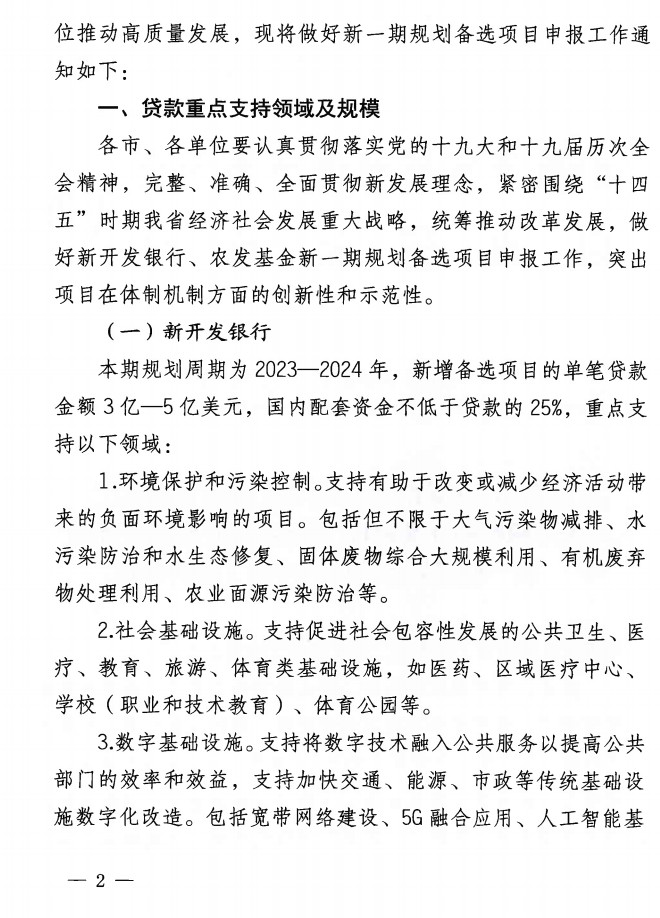 新開發(fā)銀行本期規(guī)劃周期為2023-2034年,新增備選項(xiàng)目的單筆貸款金額3億-5億美元,國內(nèi)配套資金不低于貸款的25%。重點(diǎn)支持環(huán)境保護(hù)和污染控制等。《關(guān)于做好新開發(fā)銀行國際農(nóng)業(yè)發(fā)展基金貸款新一期規(guī)劃備選項(xiàng)目申報(bào)工作的通知》(晉發(fā)改外資發(fā)【2022】151號)