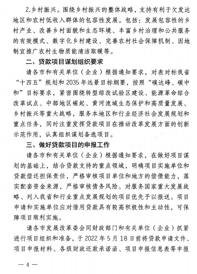 5月5日,山西發(fā)改委、山西財(cái)政廳發(fā)布了《關(guān)于做好新開發(fā)銀行國際農(nóng)業(yè)發(fā)展基金貸款新一期規(guī)劃備選項(xiàng)目申報(bào)工作的通知》。充分利用好新開發(fā)銀行、農(nóng)發(fā)基金貸款,提高利用外資水平,支持“十四五”時(shí)期山西省重點(diǎn)領(lǐng)域建設(shè),全方位推動高質(zhì)量發(fā)展。《關(guān)于做好新開發(fā)銀行國際農(nóng)業(yè)發(fā)展基金貸款新一期規(guī)劃備選項(xiàng)目申報(bào)工作的通知》(晉發(fā)改外資發(fā)【2022】151號)