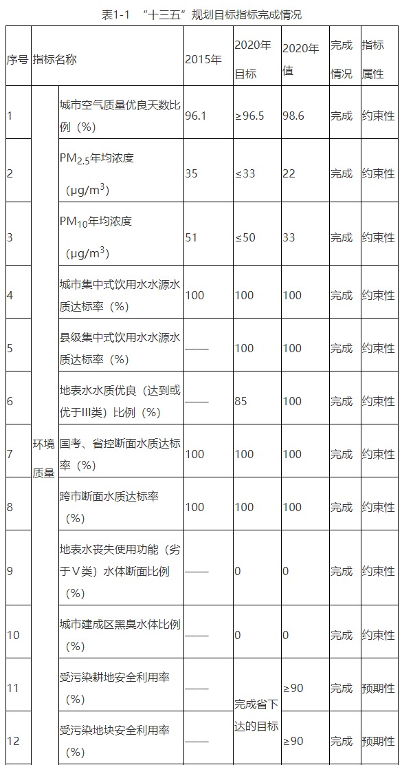 梅州市環(huán)境保護(hù)與生態(tài)建設(shè)“十三五”規(guī)劃實(shí)施情況總體良好,27項(xiàng)指標(biāo)中,除8項(xiàng)因統(tǒng)計(jì)口徑變化等原因缺乏數(shù)據(jù)外,其余19項(xiàng)全部完成規(guī)劃目標(biāo),其中城市空氣質(zhì)量?jī)?yōu)良天數(shù)比例、PM2.5年均濃度、地表水水質(zhì)優(yōu)良(達(dá)到或優(yōu)于III類(lèi))比例等主要約束性指標(biāo)超額完成目標(biāo)。