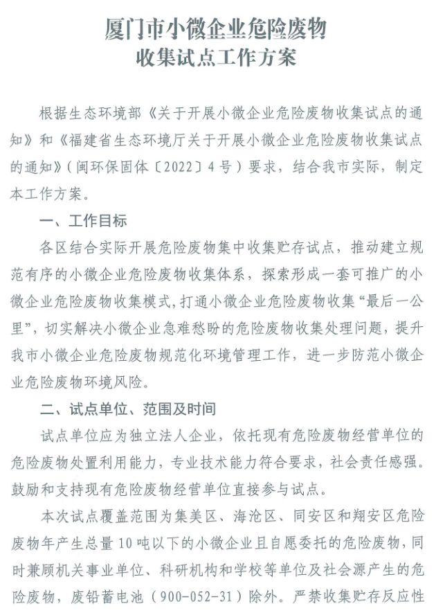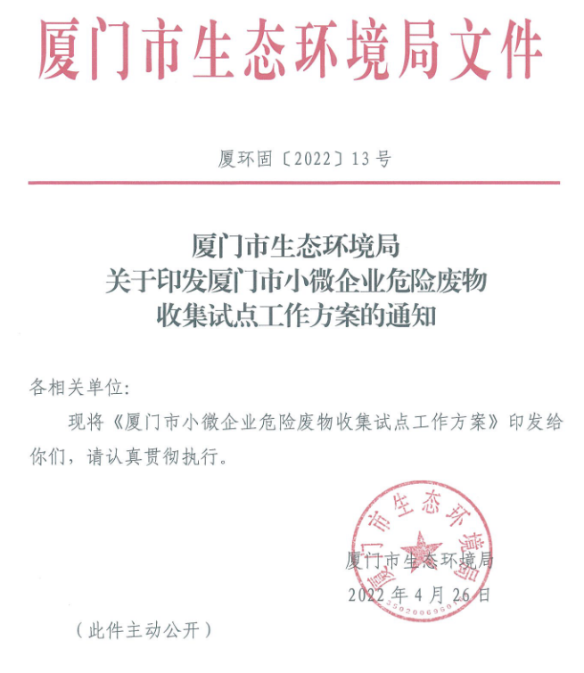 《廈門市生態(tài)環(huán)境局印發(fā)關(guān)于<廈門市小微企業(yè)危險廢物收集試點工作方案>的通知》(夏環(huán)固【2022】13號)