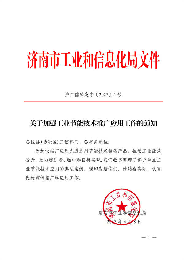 《濟南市 關于加強工業(yè)節(jié)能技術推廣應用工作的通知》(濟工信綠發(fā)【2022】5號)