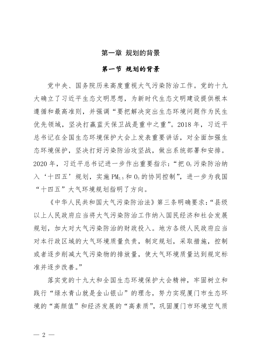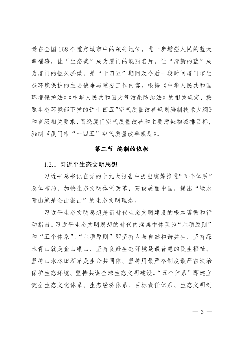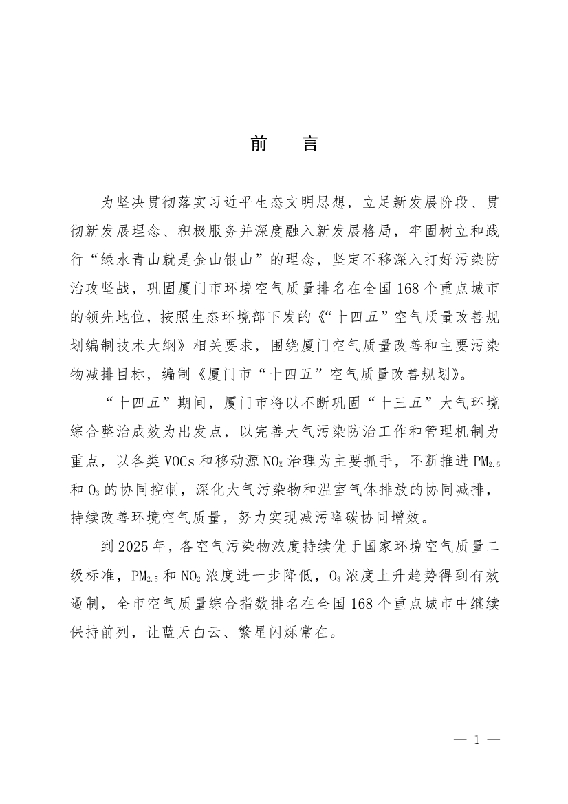 為堅決貫徹落實習(xí)近平生態(tài)文明思想,立足新發(fā)展階段、貫 徹新發(fā)展理念、積極服務(wù)并深度融入新發(fā)展格局,牢固樹立和踐 行“綠水青山就是金山銀山”的理念,堅定不移深入打好污染防治攻堅戰(zhàn),鞏固廈門市環(huán)境空氣質(zhì)量排名在全國 168 個重點城市 的領(lǐng)先地位,按照生態(tài)環(huán)境部下發(fā)的《“十四五”空氣質(zhì)量改善規(guī) 劃編制技術(shù)大綱》相關(guān)要求,圍繞廈門空氣質(zhì)量改善和主要污染物減排目標(biāo),廈門印發(fā)《廈門市“十四五”空氣質(zhì)量改善規(guī)劃》。