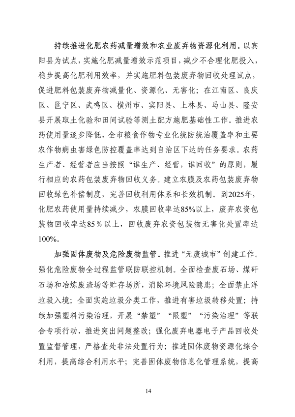 南寧生態(tài)環(huán)境局印發(fā)《南寧市土壤污染防治“十四五”規(guī)劃》,要求到2025年,全市土壤和地下水環(huán)境質(zhì)量總體保持穩(wěn)定,局部穩(wěn)中向好,受污染耕地和重點(diǎn)建設(shè)用地安全利用得到進(jìn)一步鞏固提升,土壤和地下水環(huán)境風(fēng)險(xiǎn)得到進(jìn)一步管控。確保到2022年危險(xiǎn)廢物安全處置率穩(wěn)定達(dá)到100%;到2025年,一次性塑料制品消費(fèi)量明顯減少,替代產(chǎn)品開(kāi)發(fā)應(yīng)用水平得到提升,塑料污染得到有效控制。到2025年,化肥農(nóng)藥使用量持續(xù)減少,農(nóng)膜回收率85%以上,廢棄農(nóng)資包裝物回收率85%以上,回收廢棄農(nóng)資包裝物無(wú)害化處置率達(dá)100%。