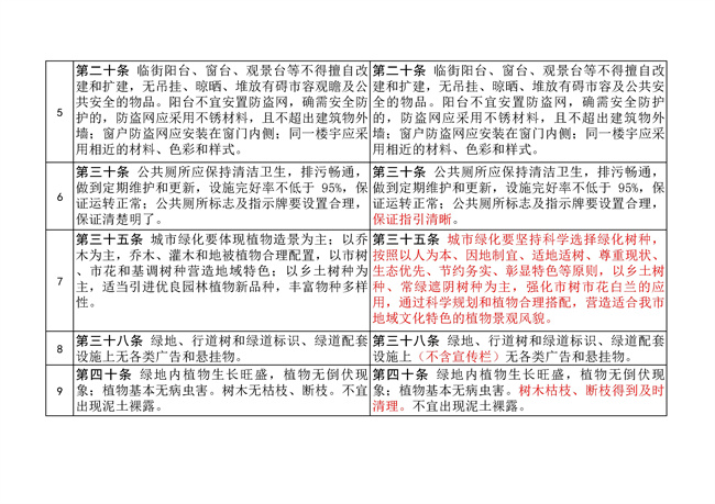 第二十八條郵政、通訊、廣播電視、電力、燃?xì)?、供水、交通、消防、環(huán)衛(wèi)、文體休閑等各類公共設(shè)施,應(yīng)規(guī)范設(shè)置,排列有序,無污染、塵土,無亂寫亂畫、亂涂亂貼,并保持設(shè)施的整潔、美觀及完好。各類廢棄的公共設(shè)施應(yīng)及時(shí)清除。