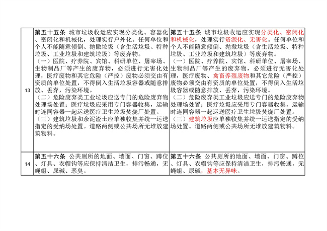 第五十五條城市垃圾收運(yùn)應(yīng)實(shí)現(xiàn)分類化、密閉化和機(jī)械化,處理實(shí)行資源化、無害化。任何單位和個人不能隨意傾倒、拋撒垃圾(含生活垃圾、特種垃圾、工業(yè)垃圾和建筑垃圾)等廢棄物。