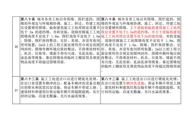 第八十條城市各類工地應(yīng)有圍墻、圍欄遮擋,圍墻的外觀宜與環(huán)境相協(xié)調(diào),施工、拆遷、待建工地應(yīng)設(shè)置硬質(zhì)圍墻。主干道臨街臨街建筑施工工地周圍宜設(shè)置不低于2.5m的遮擋墻,非主干道臨街建筑施工工地周圍宜設(shè)置不低于2m的遮擋墻,市政設(shè)施、道路挖掘施工工地圍墻高度不宜低于 1.8m,圍欄高度不宜低于 1.6m。圍墻、圍欄保持整潔、完好、美觀,并設(shè)有夜間照明裝置;2m以上的工程立面宜使用符合規(guī)定的圍網(wǎng)封閉。圍墻外側(cè)環(huán)境應(yīng)保持整潔,不得堆放材料、機(jī)具、垃圾等,墻面不得有污跡,無亂張貼、亂涂亂畫等現(xiàn)象??拷鼑鷫μ幍呐R時(shí)工棚屋頂及堆放物品高度不得超過圍墻頂部。