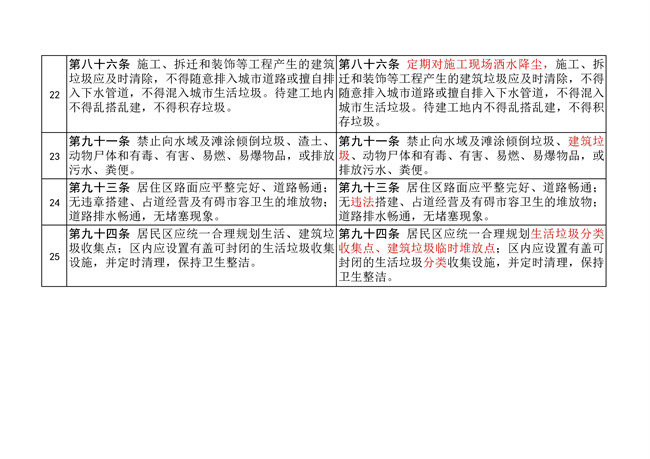 第八十六條定期對施工現(xiàn)場灑水降塵,施工、拆遷和裝飾等工程產(chǎn)生的建筑垃圾應(yīng)及時(shí)清除,不得隨意排入城市道路或擅自排入下水管道,不得混入城市生活垃圾。待建工地內(nèi)不得亂搭亂建,不得積存垃圾。