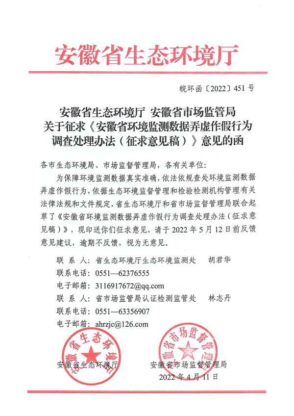 《安徽省環(huán)境監(jiān)測數(shù)據(jù)弄虛作假行為調(diào)查處理辦法》(征求意見稿)(皖環(huán)函【2022】451號)