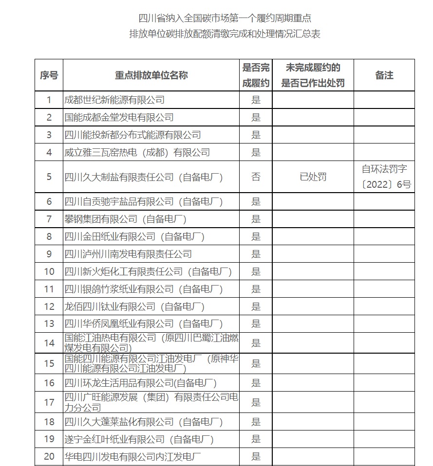《四川省 納入全國(guó)碳市場(chǎng)第一個(gè)履約周期重點(diǎn)排放單位碳排放配額清繳完成和處理情況》