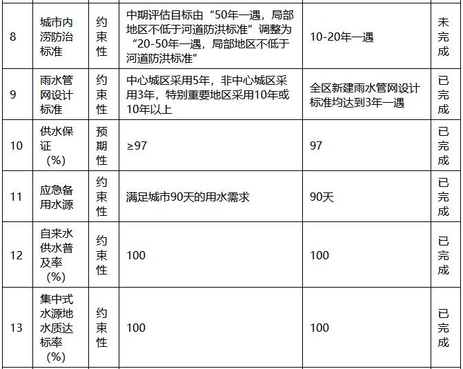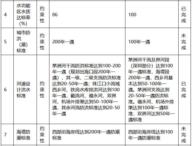 《寶安區(qū)水務(wù)發(fā)展“十三五”規(guī)劃》提出18項(xiàng)指標(biāo),其中,約束型指標(biāo)14項(xiàng),預(yù)期性指標(biāo)4項(xiàng)。截至2020年底,15項(xiàng)指標(biāo)已經(jīng)完成,目標(biāo)完成率83.3%。14項(xiàng)約束性指標(biāo)中,11項(xiàng)指標(biāo)已經(jīng)完成,城市防洪(潮)標(biāo)準(zhǔn)、海堤防潮標(biāo)準(zhǔn)、內(nèi)澇防治標(biāo)準(zhǔn)3項(xiàng)指標(biāo)尚未完成,目標(biāo)完成率78.6%。