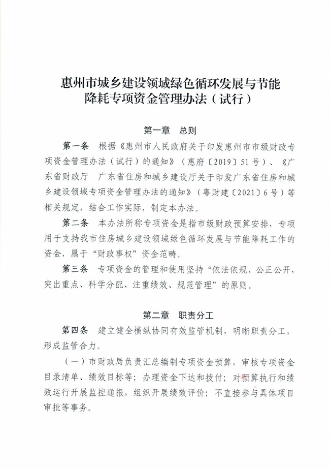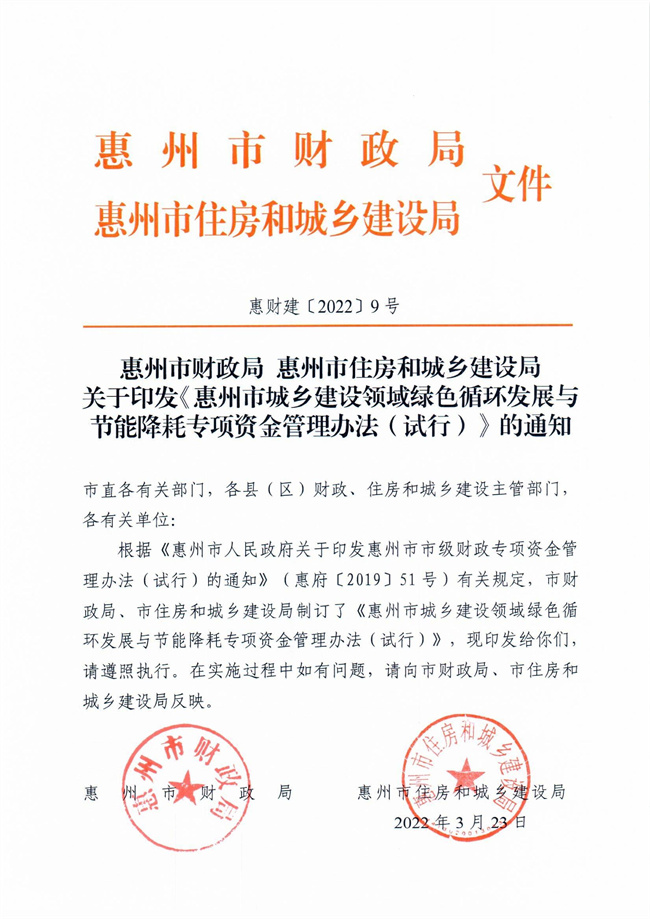 《惠州市城鄉(xiāng)建設(shè)領(lǐng)域綠色循環(huán)發(fā)展與節(jié)能降耗專項資金管理辦法(試行)》(惠財建【2022】9號)