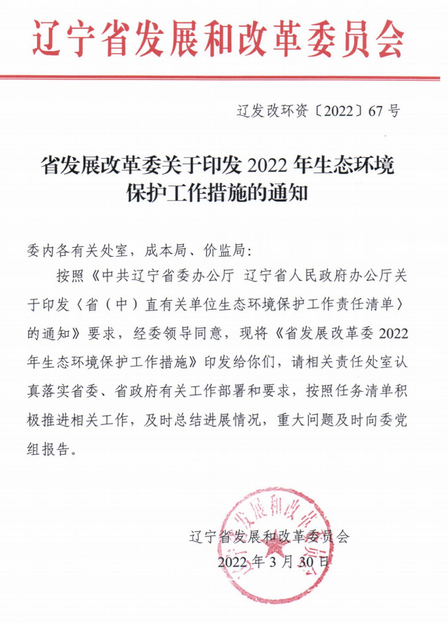 《遼寧省發(fā)展改革委2022年生態(tài)環(huán)境保護(hù)工作措施》(遼發(fā)改環(huán)資【2022】67號)