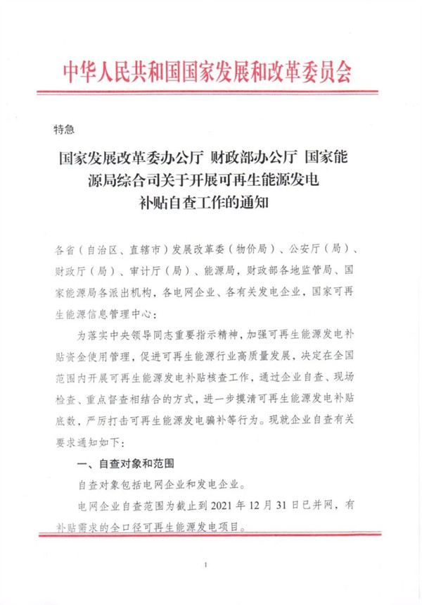 《關(guān)于開展可再生能源發(fā)電補貼自查工作的通知》