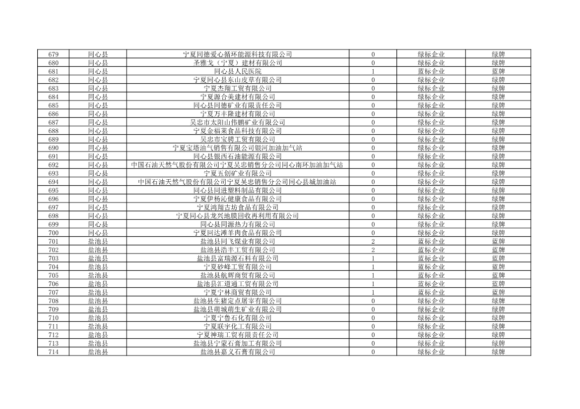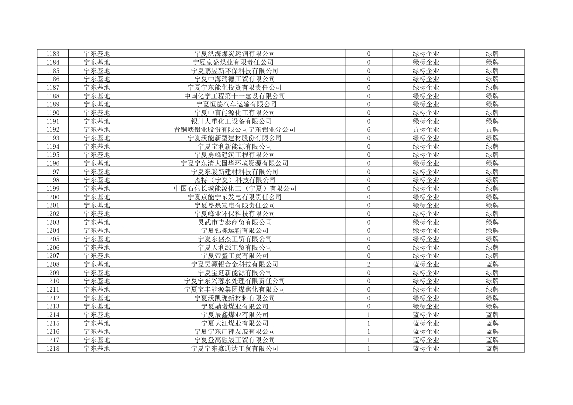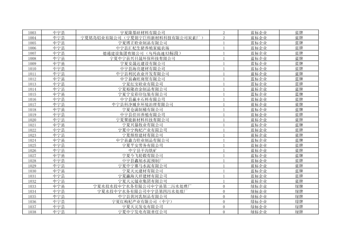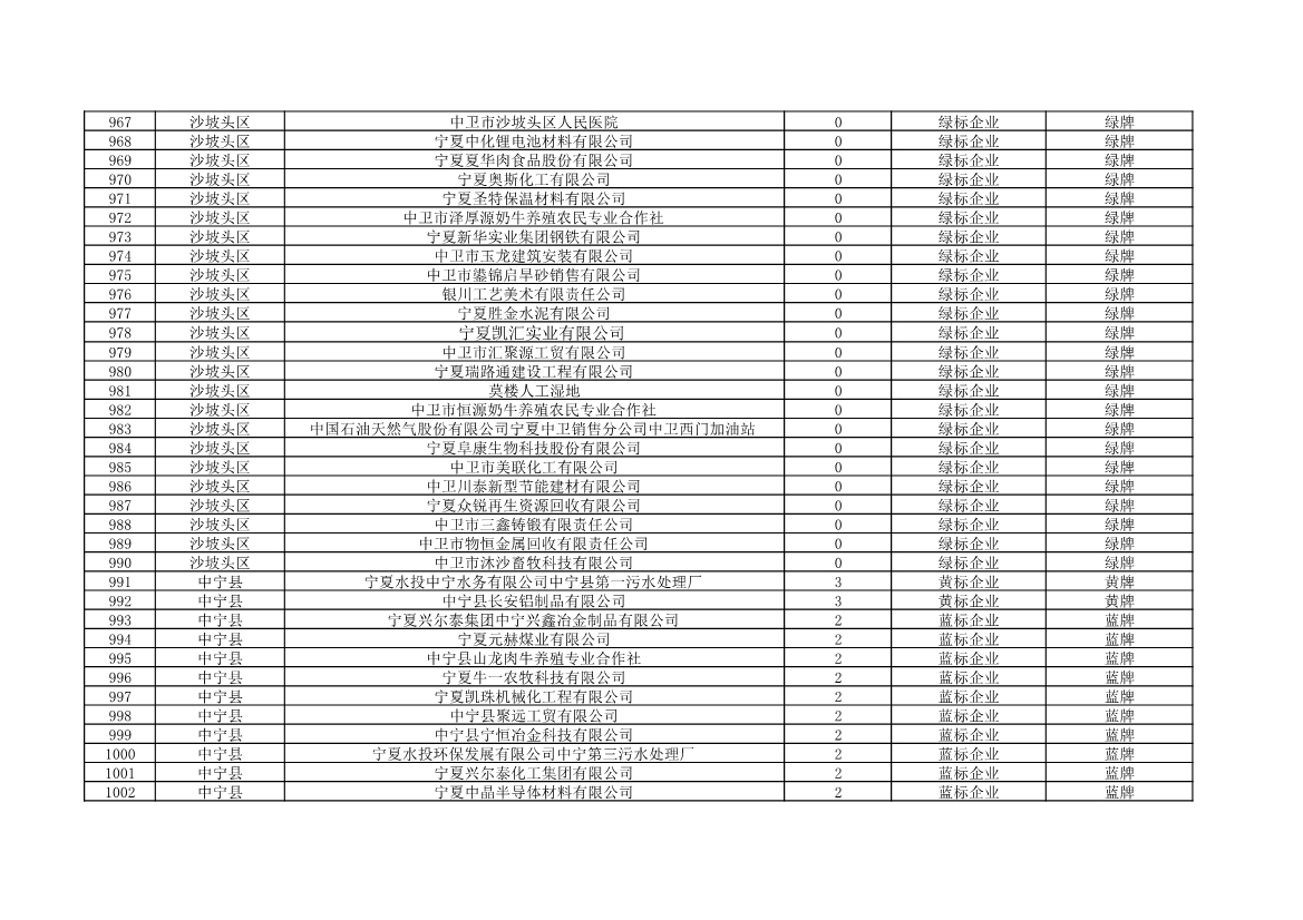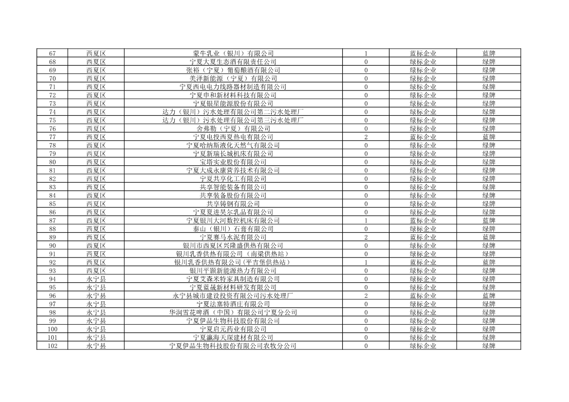 根據(jù)《中華人民共和國環(huán)境保護法》《企業(yè)信息公示暫行條例》等法律、行政法規(guī)和《企業(yè)環(huán)境信用評價辦法(試行)》(環(huán)發(fā)〔2013〕150號)、《寧夏回族自治區(qū)企業(yè)環(huán)境信用評價辦法》(寧環(huán)規(guī)發(fā)〔2019〕5號)規(guī)定,自治區(qū)生態(tài)環(huán)境廳組織全區(qū)各地級市生態(tài)環(huán)境部門開展了2021年全區(qū)企業(yè)環(huán)境信用評價工作。全區(qū)參評企業(yè)1250家,其中綠牌969家、藍牌226家、黃牌52家、紅牌3家。現(xiàn)將評價結(jié)果予以公布。